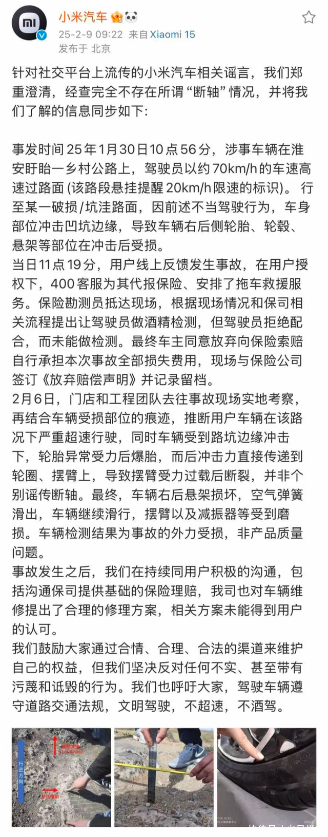 2025年春节刚过,小米汽车就因一场“断轴门”冲上热搜。一位车主声称,驾驶小米SU7以正常速度通过坑洼路段时,车辆右后轮摆臂断裂,质疑小米汽车存在质量问题。事件初期,网友纷纷心疼车主,那么真相究竟如何呢?